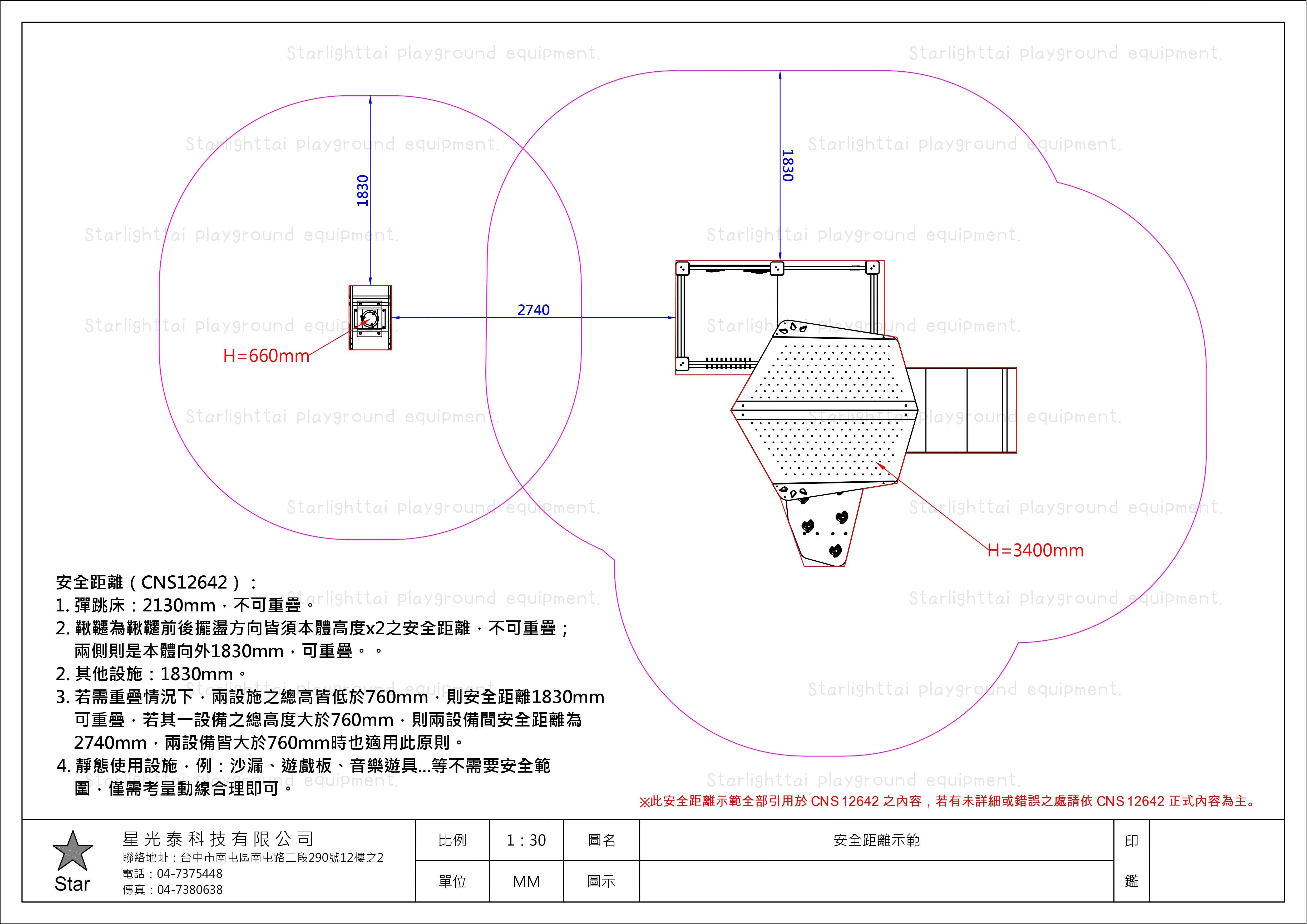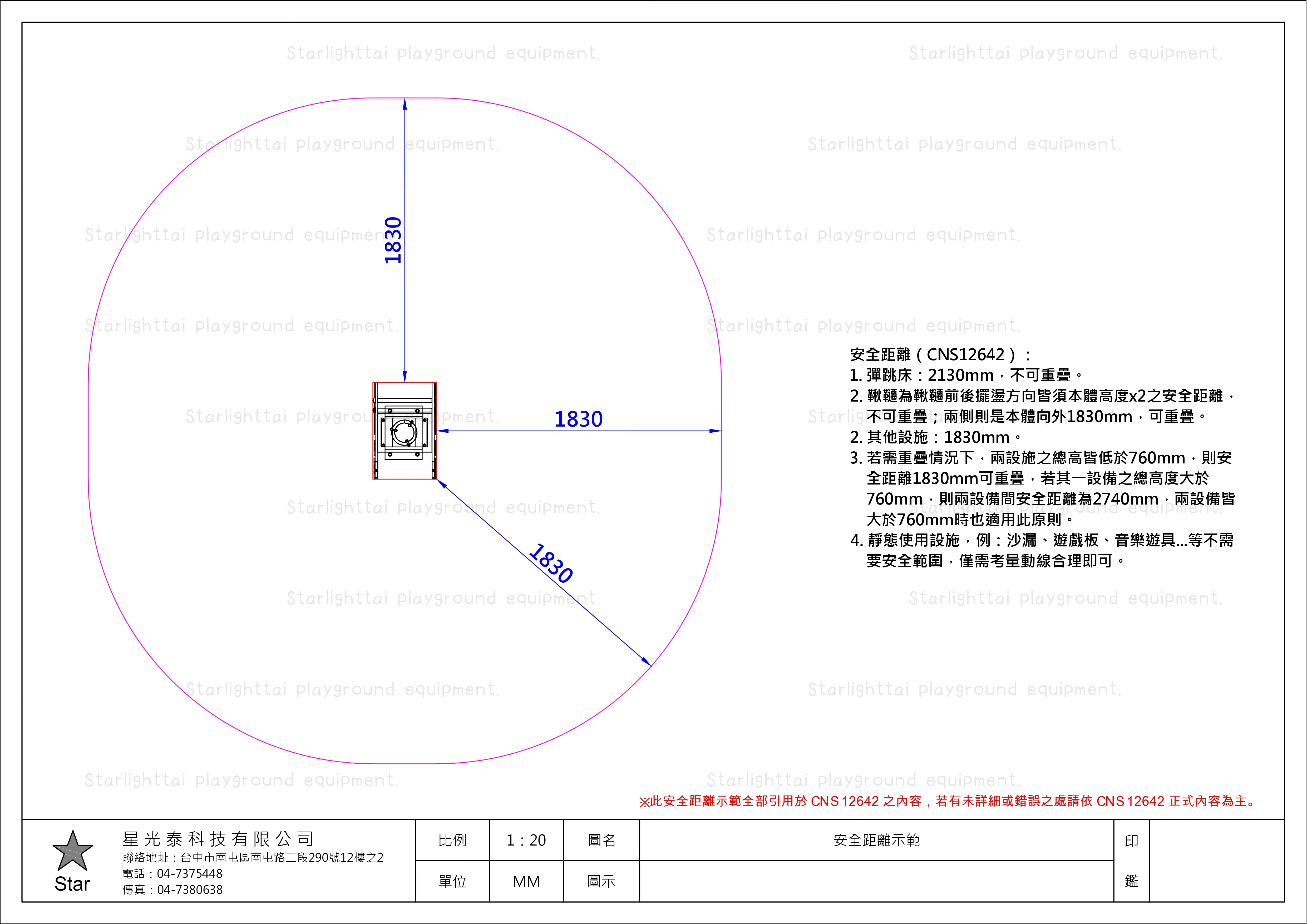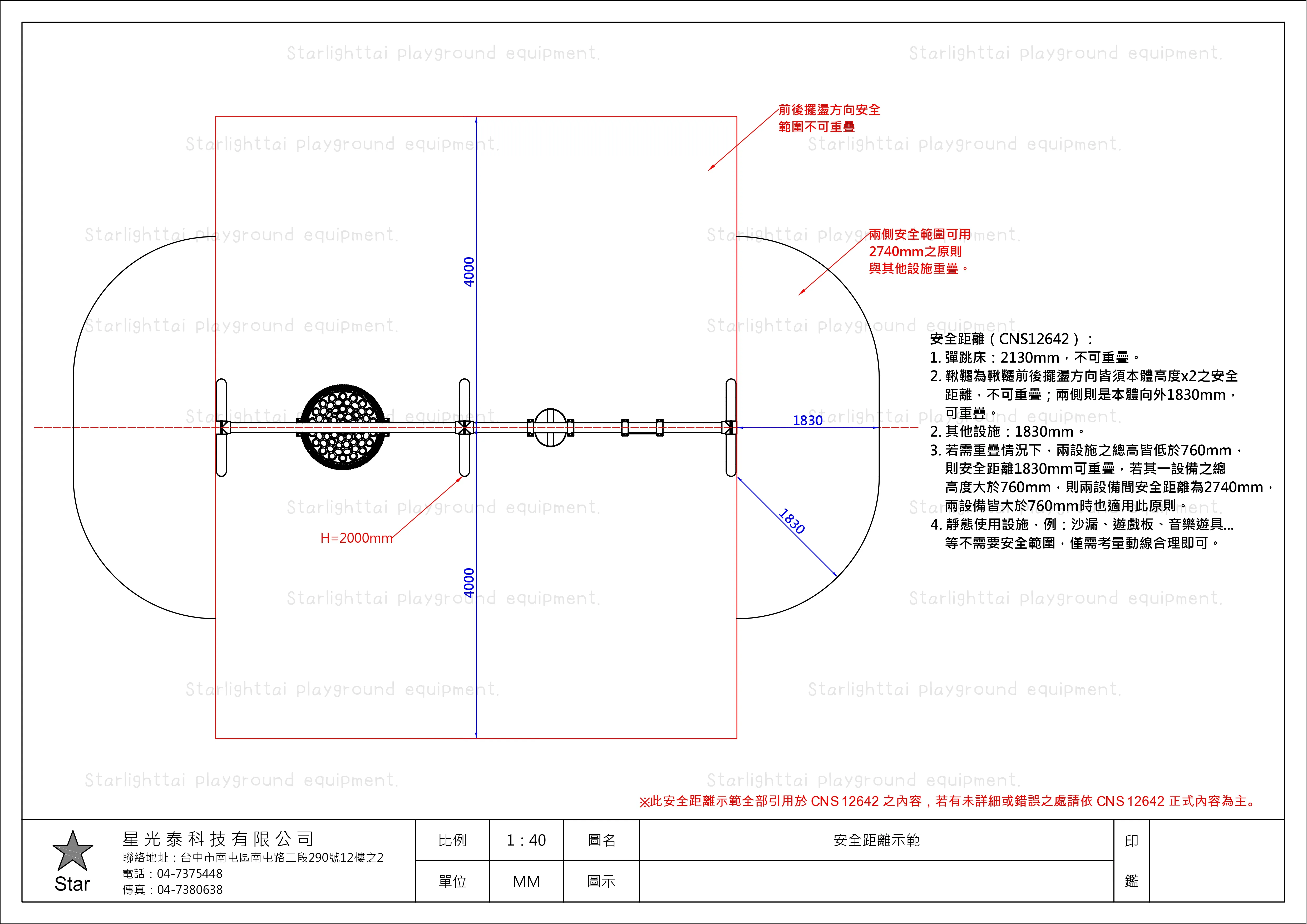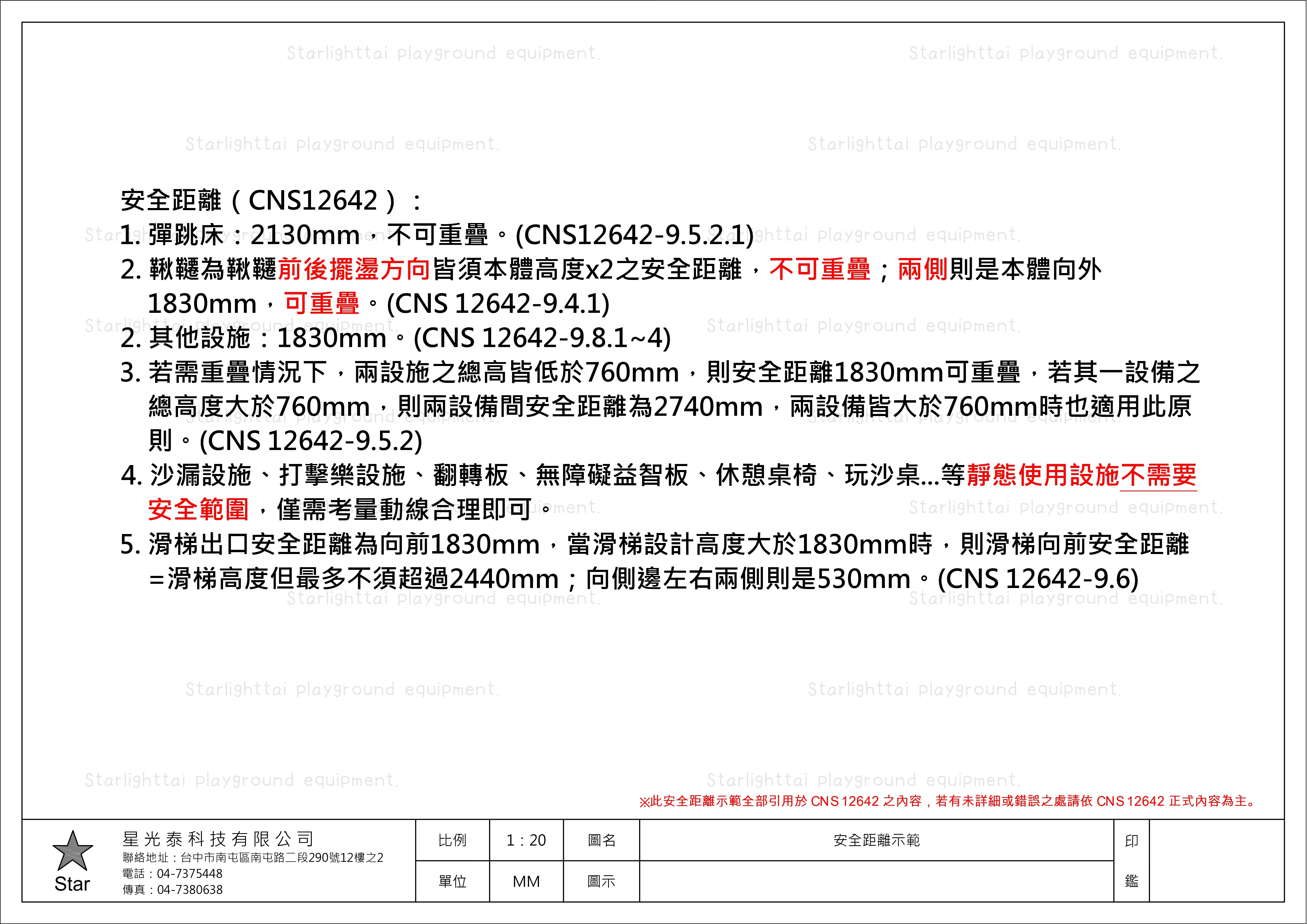 1.一般固定式遊具安全範圍:邊緣向外延伸183cm,若兩設施總高皆低於76cm則可重疊,若其一遊具總高大於76cm,則兩遊具間距為274cm。