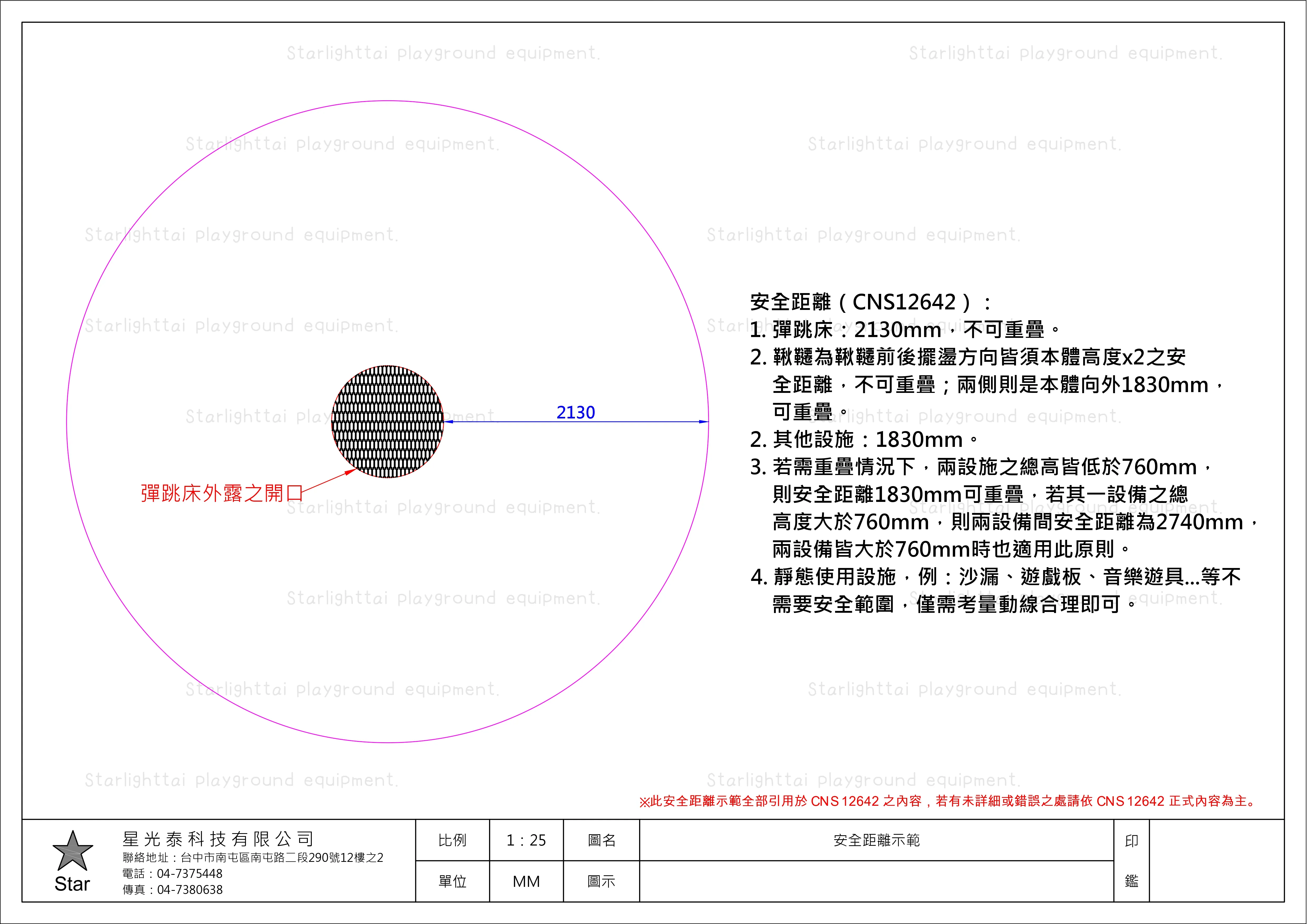 3.彈跳床安全範圍:蹦面周圍邊緣向外延伸213cm。