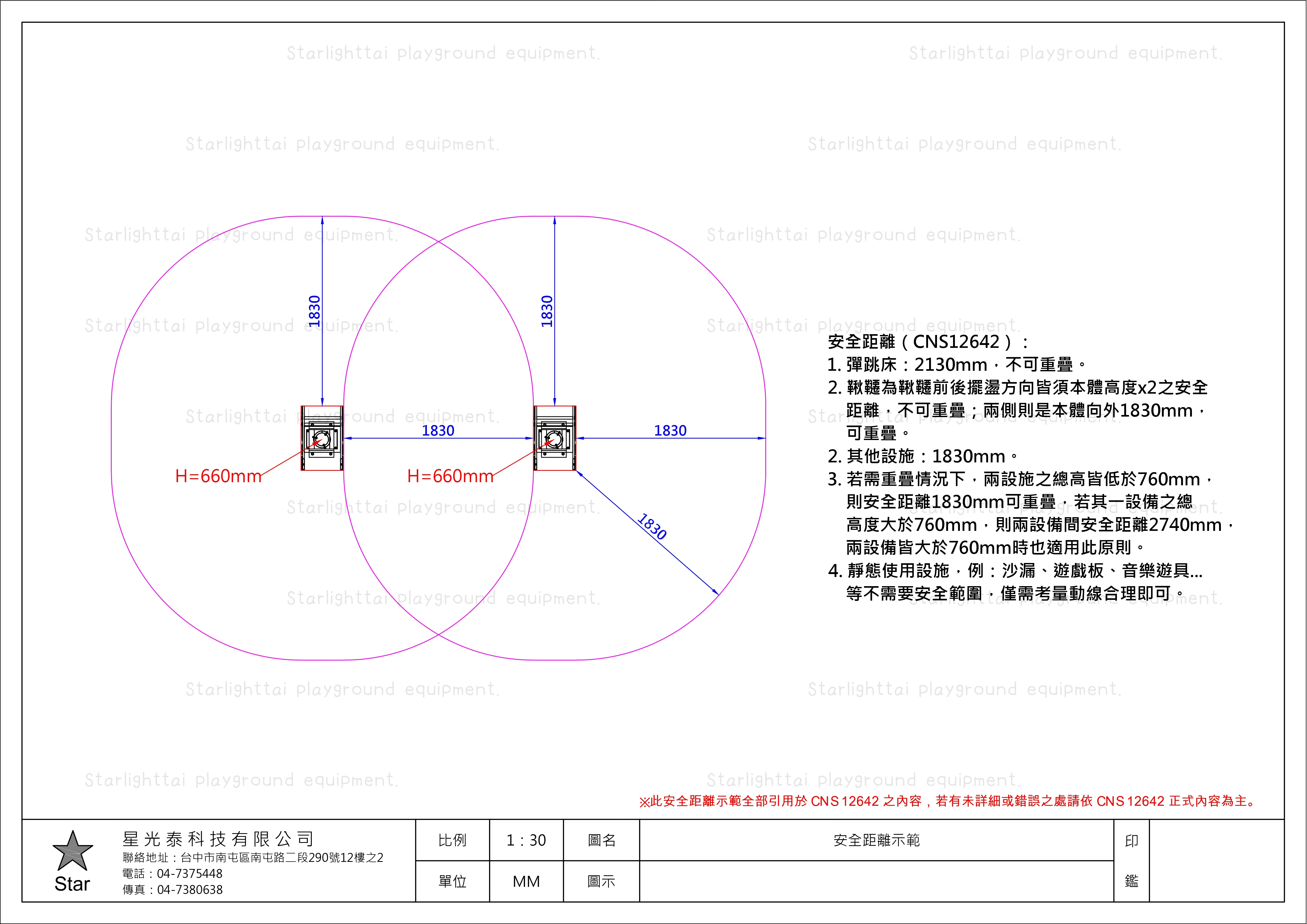 2.鞦韆安全範圍:起算點為鞦韆正中心,前後皆為鞦韆高度的兩倍,例如鞦韆高180cm,則為前180×2=360cm,後180×2=360cm。
